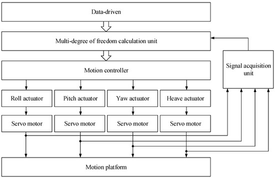The physical simulation platform utilizes a multi-degree-of-freedom motion seat to enable users to deeply experience the real-time motion posture of a vessel, thereby enhancing an immersive sensory experience. It primarily relies on PLC control and servo motor drive control, with simulated data sent from the virtual simulation platform to control the motion. The motion simulation platform framework is illustrated in Figure 5.