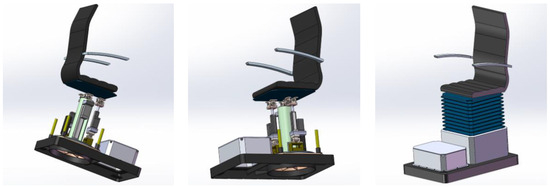 The simulation platform consists of a PLC controller, servo motors, servo-electric cylinders, servo drivers, and measuring instruments. The PLC, serving as the primary information processing unit, decodes the drive data and transmits them to the servo drivers. The servo drivers, equipped with three control modes—position control, speed control, and torque control—send high-speed differential pulse signals (4 Mpps) to drive the motors and electric cylinders, achieving precise position settings and facilitating the four-degrees-of-freedom motion of the seat module. The minimal coupling between different degrees of freedom makes the system easy to control. The mechanical structure of the seat is illustrated in Figure 6.
