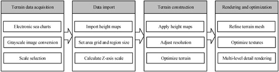 Additionally, a real-time terrain update mechanism was introduced, allowing dynamic adjustments to the virtual terrain model based on the latest survey data and marine observation information, reflecting changes in the actual marine environment. The resolution and realism of the terrain model are enhanced through refined mesh and multi-level detail rendering techniques, ensuring rapid and reliable modeling results. The ocean environment modeling process is illustrated in Figure 8.