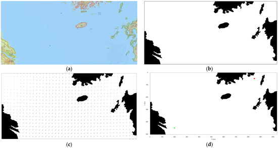 Validation test sea area image preprocessing: (a) Electronic nautical chart image; (b) Binarized image; (c) Regional wind direction distribution map; (d) Route planning area.