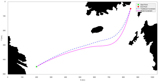 The experimental results reveal that the optimized constraint model demonstrates advantages in overall smoothness and path length. The sailing distance generated by the traditional constraint model is 434.15 nautical miles, while the optimized constraint model produces a path length of 449.06 nautical miles, slightly increasing the distance. This increase is due to the optimized constraint model’s consideration of more complex factors encountered during actual navigation, such as the impact of sea conditions on ship rolling. Consequently, this model avoids potentially hazardous areas during path planning, enhancing both the safety and stability of the voyage.