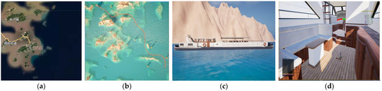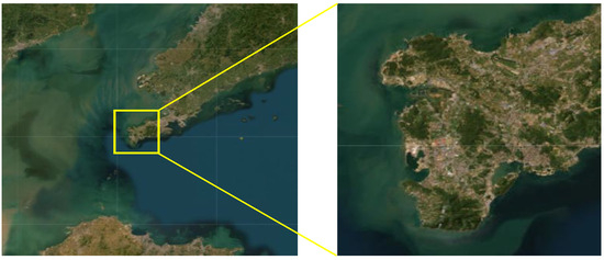To validate the accuracy and reliability of virtual terrain and environment construction, this Section focuses on creating a virtual terrain based on satellite images of a portion of the Bohai Sea and Yellow River regions in China, followed by comprehensive testing and evaluation. High-resolution satellite images of the Bohai Sea and Yellow River regions were selected as the data source for this test. These images were used to extract terrain and topographic features, including islands, reefs, and slopes, as shown in Figure 14.