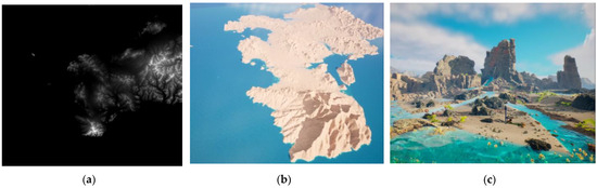 The process of constructing the marine terrain: (a) Target sea area height grayscale map; (b) Generated basic terrain model; (c) Terrain model after detailed optimization.
