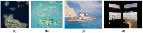 Ship route planning simulation in the waters near Zhoushan, China (Zhoushan is a coastal city in Zhejiang province of China): (a) satellite map of the waters near Zhoushan; (b) overhead view of path planning results in the virtual system; (c) virtual model of a small ship; (d) cabin interior view during simulation.