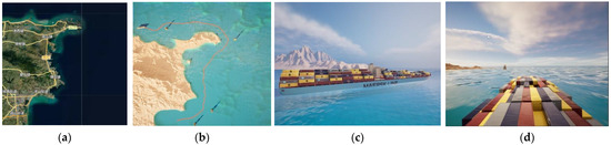 Ship route planning simulation in the waters near Weihai, China (Weihai is a coastal city in Shandong province of China): (a) satellite map of the waters near Weihai; (b) overhead view of path planning results in the virtual system; (c) virtual model of a container ship; (d) on-board view during simulation.