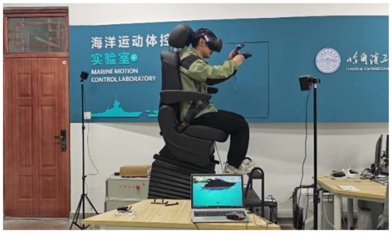 The system’s performance is illustrated in Figure 22, where the user is seated on a four-degree-of-freedom motion simulation platform, operating the system with VR glasses and controllers. The VR glasses immerse the user in a completely virtual ocean environment, while the controllers are used to manage and adjust the ship’s path planning. The motion simulation platform dynamically adjusts the seat’s posture and movements in real-time based on the ship’s state within the virtual environment, enhancing the user’s sense of immersion and realism. This setup not only allows users to observe and modify the path planning more intuitively but also provides an experience of the actual navigational movements.