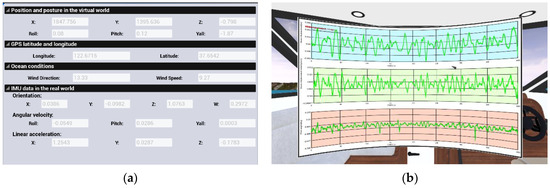 The UI of the virtual path planning system encompasses various modules designed to display and control the ship’s position and orientation in the virtual world, GPS coordinates, ocean conditions, and real-world Inertial Measurement Unit (IMU) data. Specifically, the UI presents the ship’s coordinates in the virtual environment, along with the roll, pitch, and yaw angles. Additionally, the interface shows the current GPS latitude and longitude, wind direction, and wind speed, as well as real-time IMU data on orientation, angular velocity, and linear acceleration. These features provide users with a comprehensive operational platform to monitor and adjust various parameters throughout the virtual path planning process. Furthermore, the system continuously displays the ship’s motion-state curve data, helping users visually understand the ship’s behavior under different sea conditions. These data enable users to analyze and validate the effectiveness and stability of the path planning algorithm. Moreover, the system supports real-time saving of attitude data, facilitating subsequent data analysis and research.