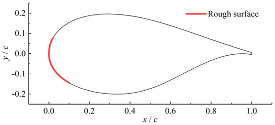 The dedicated wind turbine airfoil DU 00-W-401 is selected as the calculation object in this research, as it is a typical thick wind turbine airfoil [17]. For the rough airfoil cases, a continuous region around the leading-edge region is set as the rough surface, as shown in Figure 1. The starting and ending position of the roughness follows the experiment scheme of Van Rooij et al. [17], in which bump tapes of 0.5 mm thickness were set at 2% of chord on the upper surface and at 10% of chord on the lower surface. The chord length c is 600 mm, and the calculated Reynolds number is 3.0 × 106, corresponding to a freestream inflow velocity 73 m/s.