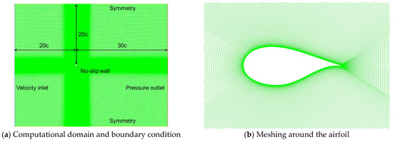 The computational domain is illustrated in Figure 2a. The upper and lower surfaces are 20c away from the airfoil and set as the symmetry boundary. The velocity inlet boundary was 20c upstream of the airfoil and the pressure outlet boundary was 30c downstream of the airfoil. The turbulence intensity at both the inlet and outlet boundaries was set to 0.02% to create a laminar inflow condition, ensuring natural transition for the case with a smooth leading edge. Quadrilateral structured grids were built through an O-type topological structure around the airfoil, as show in Figure 2b. The mesh in the boundary layer was well resolved, with the first layer around the airfoil being 0.01 mm, with a wall normal grid expansion ratio of 1.1. Correspondingly, the value of y+ was below 1.0 on the airfoil’s surface, which complies with the requirements for applying the current turbulence model [22].