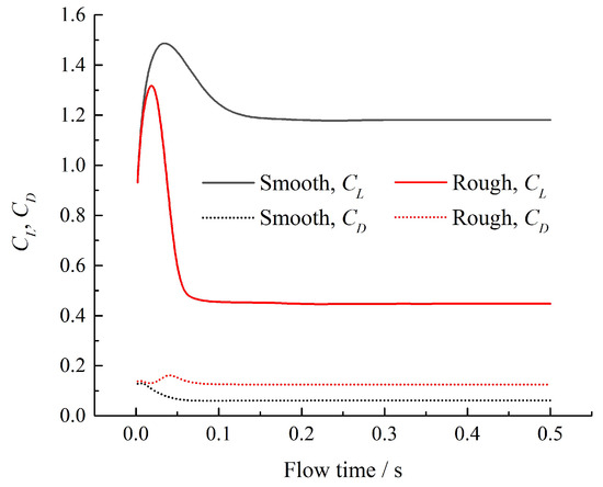 A time step of 0.001 s was selected, and stable convergence of the lift and drag coefficients was observed across the range of angles of attack considered. Figure 3 illustrates the convergence history of these coefficients at an AOA of 14°. Despite the use of an unsteady scheme, the simulation results demonstrated converged and stable aerodynamic performance without significant unsteady fluctuations. This stable convergence is consistent with findings from previous work [20,21], which suggests that the turbulence model may have averaged out the unsteady fluctuations, resulting in a stable vortex structure that ultimately converges.
