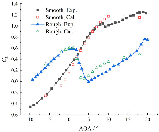 Lift coefficient of the smooth and rough airfoils (experimental data is adapted from Ref. [17]).
