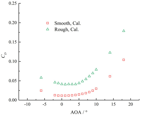 Figure 5 displays the calculated drag coefficients for both smooth and rough airfoils. The smooth airfoil exhibits its lowest drag coefficient, approximately 0.01, at an AOA of 0°. The drag coefficient increases as the AOA deviates from 0°, either increasing or decreasing. For AOAs greater than 8°, the drag coefficient rises sharply, attributed to the onset of trailing edge separation on the upper surface and the consequent increase in pressure drag. In contrast, the rough airfoil consistently exhibits a higher drag coefficient curve compared to the smooth airfoil. At AOAs near 0°, where friction drag predominates, the difference in drag coefficient is approximately 0.03, likely due to the increased friction drag caused by the leading-edge roughness. As the AOAs increase, the difference in drag coefficient grows, which may be attributed to changes in the separation condition induced by the roughness at the leading edge, leading to a more significant pressure drag. Notably, there is a slight decrease in the drag coefficient between AOAs of 2° and 4°. The reasons behind this decrease will be examined in the following subsections.