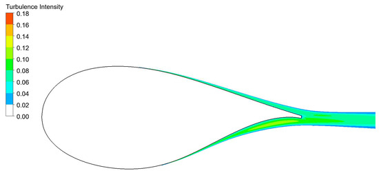 Figure 8 and Figure 9 display the contours of turbulence intensity and the nondimensional streamwise wall shear of the rough airfoil at 0° AOA, respectively. Due to the influence of leading-edge roughness, the boundary layer on the rough airfoil is fully turbulent, with regions of high turbulence intensity covering the entire airfoil surface, as seen in Figure 8. This complete transition eliminates the presence of a laminar separation bubble, as observed in Figure 9. This indicates that the primary effect of the leading-edge roughness is to establish a fixed-transition condition, resulting in a turbulent boundary layer over most of the airfoil surface. Figure 9 also reveals that the wall shear around the leading edge of the rough airfoil is significantly higher than that of the smooth airfoil, contributing to the higher drag coefficient seen in Figure 5. When the flow passes the end of the leading-edge roughness, at approximately 2% of the chord (c) on the upper surface and 10% of the chord on the lower surface, there is an abrupt drop in wall shear. The turbulent separation point on the lower surface moves upstream to around 52% of the chord, compared to the smooth airfoil. Additionally, the scale of the trailing-edge separation vortex increases, accompanied by high turbulence intensity. The flow on the upper surface remains attached, similar to the smooth airfoil.