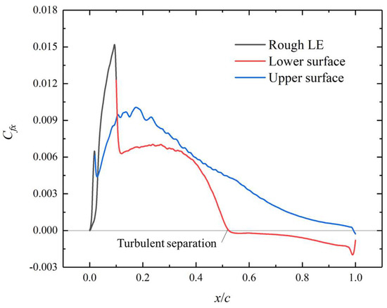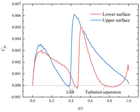 where is the streamwise wall shear. The value of is positive if the flow is attached and negative for reversed flow, providing an intuitive depiction of the laminar separation bubble and turbulent separation point positions. According to Figure 7, the laminar separation bubble is located around 46% of the chord on the lower surface and around 38% of the chord on the upper surface. Beyond these points, the flows reattach and the boundary layer becomes turbulent. This indicates that the turbulence model used in this research can simulate the free-transition condition of airfoils effectively. Additionally, a small trailing-edge separation vortex is observed at around 75% of the chord on the lower surface, while turbulent separation is absent on the upper surface. This phenomenon is due to the higher adverse pressure gradient from the maximum thickness position to the trailing edge on the lower surface.