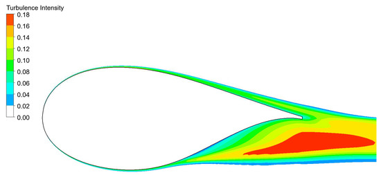 Figure 6 illustrates the contour of turbulence intensity around the smooth airfoil at an AOA of 0°. The boundary layer flow is laminar before reaching halfway along the chord, exhibiting relatively low turbulence intensity. As the flow passes around the mid-chord, the thickness of the region with high turbulence intensity gradually increases, indicating a transition to a turbulent boundary layer. Figure 7 presents the nondimensional streamwise wall shear at this condition, defined by