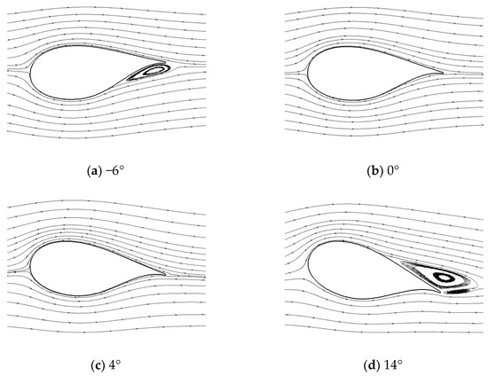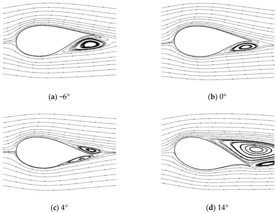 The streamlines around the smooth and rough airfoils at different AOAs are shown in Figure 10 and Figure 11, respectively. For the smooth airfoil, the flow remains fully attached at AOAs of 0° and 4°, where the lift coefficient curve increases linearly. A trailing-edge separation vortex appears on the lower surface at an AOA of −6°, and on the upper surface at an AOA of 14°, where the lift coefficient curve deviates from its linear increase. These flow patterns are similar to those observed on traditional thin airfoils of combined trailing-edge and leading-edge stall types.