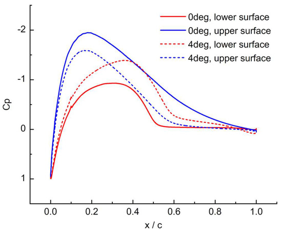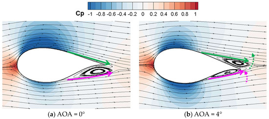 To elucidate the formation mechanism of the negative-slope lift performance of the rough airfoil around 0° AOA, the pressure contours and streamlines at 0° and 4° AOA are compared, as shown in Figure 12. The characteristic streamlines between the main stream and the separation vortex were extracted and marked in the figure. Given that the normal pressure variation is minimal in the separation region, the airfoil profile combining these characteristic streamlines can be considered as an enclosed control body, which approximately conforms to potential flow theory. For the lower surface, as the AOA increases from 0° to 4°, the characteristic streamline rises while the trailing-edge separation vortex diminishes. Consequently, the adverse pressure gradient from the maximum thickness position to the trailing-edge confluence increases, resulting in a stronger negative pressure around the maximum thickness on the lower surface. In contrast, on the upper surface, the characteristic streamline also rises but the trailing-edge separation vortex enlarges. This causes a reduction in the adverse pressure gradient from the maximum thickness position to the trailing-edge confluence, leading to a weaker negative pressure around the maximum thickness position. The resulting pressure coefficient distribution is shown in Figure 13. The combined effect of the enhanced negative pressure peak on the lower surface and the weakened negative pressure peak on the upper surface causes a significant drop in airfoil lift as the AOA increases from 0° to 4°, thereby demonstrating a distinct negative-slope lift performance.