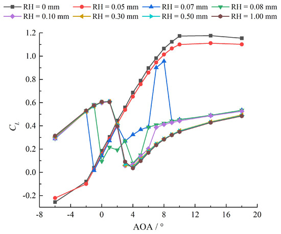 The aerodynamic performance of smooth and rough airfoils differs significantly, as detailed in the previous subsections. This raises the question of whether a critical state exists between these two performance regimes. To explore this, the effect of roughness height (RH) on airfoil performance is further analyzed, as illustrated in Figure 14. At low roughness heights (RH ≤ 0.05 mm), the lift coefficient curve closely mirrors that of a smooth airfoil, with both the lift slope and post-stall lift gradually decreasing as RH increases. This suggests that at low RH, the aerodynamic characteristics are only marginally affected, exhibiting a performance similar to that of a smooth airfoil, albeit with a slight decline. Conversely, at high roughness heights (RH ≥ 0.30 mm), the lift coefficient curve adopts a distinctive “N” shape, showing minimal variation with further increases in RH. This indicates that at high RH, aerodynamic performance is predominantly governed by the roughness, leading to a significantly altered and less efficient lift behavior that stabilizes in this new regime. For medium roughness heights (0.07 mm ≤ RH ≤ 0.10 mm), an intermediate condition emerges, characterized by unstable flow behavior as the angle of attack (AOA) increases, resulting in multiple saltation points in the lift curve. This reflects a transitional state where aerodynamic performance is neither fully smooth nor fully rough, leading to fluctuating and unstable lift characteristics.