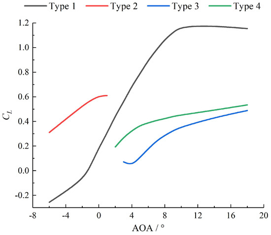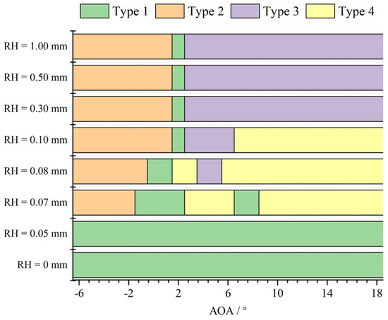 The Type 1 Flow Regime primarily occurs on relatively smooth airfoils (RH ≤ 0.05 mm). The flow patterns with increasing AOA are similar to those observed on traditional thin airfoils, as depicted in Figure 10. As the AOA increases from −6° to 18°, the flow undergoes a transition from trailing-edge separation on the lower surface to full attachment and finally to trailing-edge separation on the upper surface. The value of the lift coefficient decreases with increasing roughness, which is also similar to the behavior observed on traditional thin airfoils.