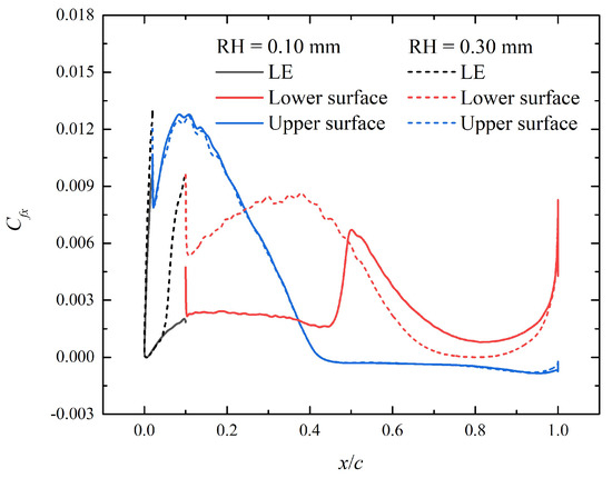 Nondimensional streamwise wall shear around the rough airfoil at 10° AOA (RH = 0.10 mm and 0.30 mm).