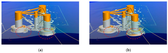 Vortex field near the platform in different drafts. (a) Before increasing the distance between damping plates and free surface; (b) after increasing the distance between damping plates and free surface.