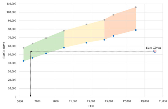 Figure 2 illustrates the standard maximum continuous rating (SMCR) of engines installed on container ships up to 10,000 TEU (green polygon), along with projections for larger mother ships during the short-term development of container vessels up to 14,500 TEU (orange), and eventually up to 18,000 TEU (red) [22]. It also shows that modern vessels exceeding 20,000 TEU (such as the Ever Given) are powered by engines with less than 60,000 kW, which is comparable to the engine size of ships built 10 years earlier, whose capacity (expressed in TEU) was approximately three times smaller, as indicated by the dashed arrow.