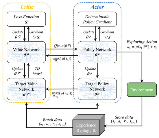 The deep deterministic policy gradient (DDPG) algorithm is a model-free, policy-based, and off-policy reinforcement learning algorithm designed to solve control problems in continuous action spaces. DDPG uses the actor–critic methodology to learn and optimize policies, and it was developed specifically to overcome the limitations of deep Q-networks (DQN). DDPG consists of two neural networks: an actor and a critic. Figure 3 demonstrates the principle of the DDPG algorithm [33,34].