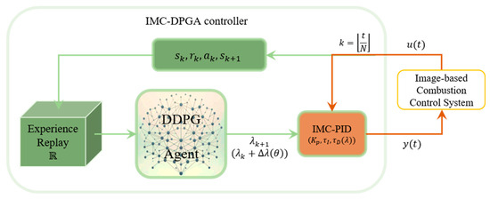 The IMC-DPGA control system shown in Figure 4 illustrates the structure for dynamically updating the of the IMC-based PID controller using the DDPG algorithm. This system aims to achieve optimal performance of the PID controller under changing environmental conditions. The image-based combustion control system handles a continuous process in real-time, where the DDPG algorithm efficiently learns the optimal policy within a continuous action space. This distinguishes it from other reinforcement learning algorithms that focus on discrete action space. The agent receives information from the ICC system, observes the state , receives a reward , and repeatedly determines and updates the action , leading to a new state . These updates allow the agent to adapt to the environment and estimate the appropriate value of to improve control performance.