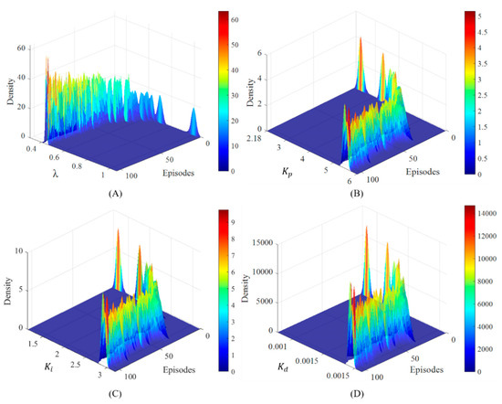 Moreover, if PID parameters are learned sporadically, the range of action variables can widen, potentially leading to the curse of dimensionality. However, in internal model control, the values of , , and are determined by the internal model , and they vary organically within the range set by the [36]. By learning the to achieve optimal control performance, the number of action variables can be reduced from three to one, and the range can be limited. This can make the learning of the deep reinforcement learning agent more stable and faster. Additionally, since the control parameters are dynamically connected by the internal model, it is possible to prevent control instability caused by sporadic parameters, thereby ensuring stable control performance even during the learning process.