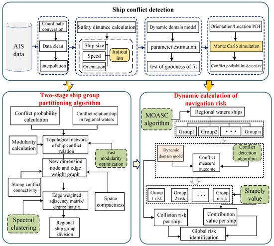 The rest of the study is organized as follows: The second section summarizes the two current paths of studying the risk of ship collision. In the third section, the proposed dynamic calculation method of navigation risk is introduced in detail, including ship conflict probability detection, ship group extraction, and key ship identification. The fourth section gives the application results and performance test of the actual AIS data experiment. The fifth section gives the conclusion.