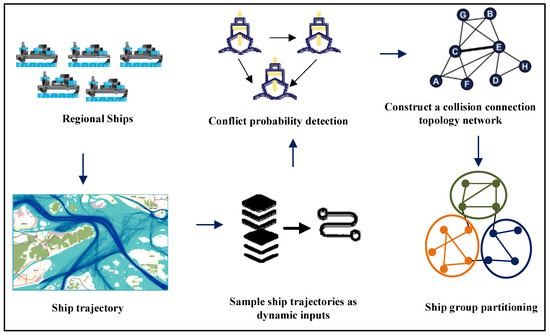 In addition, the current research on ship dynamic group detection only focuses on the distance relationship between ships and fails to effectively consider the influence of factors such as the uneven spatial distribution of ships and the geographical characteristics of complex navigable waters. This paper comprehensively considers the risk relationship and spatial distance between ships and divides regional ship traffic into multiple dynamic groups, which helps to reduce the difficulty of understanding ship traffic situation in the whole water area, and further assists in identifying local high-risk/high-density multi-ship encounter scenarios.
