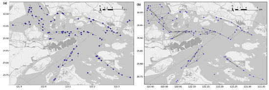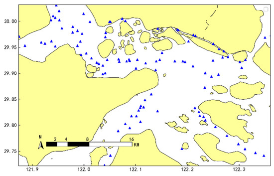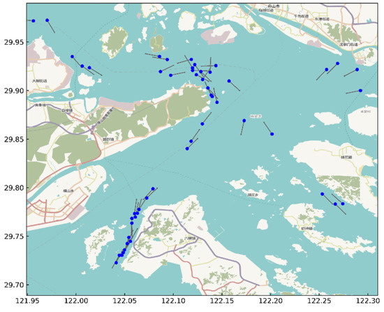 Ningbo-Zhoushan Port was selected as the experimental research area to test the dynamic calculation method of ship navigation risk proposed in this paper. In terms of cargo throughput, the port is the largest port in the world with high traffic density, limited navigable waters, and complex spatiotemporal uncertainty in ship movement. Therefore, the port is a representative of complex waters. AIS data for one month were collected from the port. The region for evaluation is bounded between the longitudes 122°06 E–122°16 E and latitudes 29°49 N–29°57 N (see Figure 9). Since ships such as fishing vessels, pilot boats, and tugboats often coexist to perform tasks and may not comply with conventional maritime safety rules, the experimental analysis used AIS data from general commercial ships including cargo ships and tankers. Although AIS provides a powerful and easily accessible data source for maritime traffic research, the collected data often have problems such as missing data or incorrect position and speed information due to various technical failures. Therefore, the AIS data preprocessing module is crucial to improve data quality. This study adopts a systematic preprocessing procedure to clean the data; in this way, we can remove possible noise and reconstruct clean and reliable trajectory data for the experimental analysis. In other words, this data-cleaning process is a prerequisite for real-time analysis.