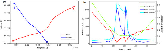 To test the performance of the proposed approach under the condition that the encountering ships have changeable spatiotemporal motion behaviors, a ship-pair encounter scenario derived from the historical data is presented (see Figure 10). The lines in Figure 10 are the trajectories of the ship pair involved in the encounter, where “x” marks the ships’ starting locations and “△” are their final locations. It can be seen that one ship basically sails linearly, while another one has a turning behavior during the encounter. The data of the ships at corresponding times are input into the conflict probability calculation model to obtain the ship conflict analysis diagram, as shown in Figure 10b.
