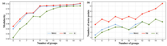 It can be seen from Figure 13b that the number of noise points of the SC algorithm is significantly lower than that of the FMO, while the number of noise points obtained by the FMOASC algorithm proposed in this paper is very close to that of the SC algorithm. As the number of groups increases, especially when the number of groups is 10 or more, the noise point number curves of FMOASC and SC almost overlap, so the number of noise points obtained by FMOASC is small. FMOASC combines the FMO and SC algorithms to divide the ship groups. The algorithm integrates the advantages of the two algorithms, which can not only maintain a high modularity, but also minimize the number of noise points, and has a balanced performance in modularity and the number of noise points.