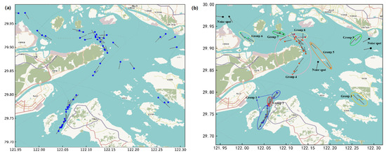 The ships in the research waters at a certain moment (as shown in Figure 12) were grouped using the FMO, SC, and FMOASC algorithms, and a comparative experiment was conducted using modularity and the number of noise points as grouping indicators. FMOASC was used as the experimental group, and FMO and SC were used as the control group. The results are shown in Figure 13.