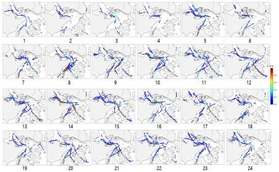 Using 7,680,496 AIS data from the study area for one month, conflict data were calculated. The conflict distribution visualization diagram for each hour is shown in Figure 16. The numbers under each sub-figure in the figure represent 24 time periods, such as “1” which represents the conflict distribution during the 00:00–01:00 time period. As shown in Figure 16(1–4), the number of ship conflicts during the 00:00–04:00 time period is relatively small; in Figure 16(5–15), the conflict distribution area is wider and is roughly distributed in the Fudu Waterway, Luotou Waterway, and Xiazhimen Channel. Among them, the frequency of ship conflicts in the Luotou Waterway and Xiazhimen Channel is higher. The reason for the higher frequency of conflicts in the Luotou Waterway is that ship traffic from other directions converges in this water area, increasing the frequency of multiple ship encounters. In addition, ship turning due to terrain geometric constraints in this water area may also be one of the reasons for this result. In fact, the Luotou Waterway is an official warning area issued by the Ningbo-Zhoushan VTS Center, which to some extent verifies the effectiveness of the conflict probability detection method proposed in this paper in identifying high collision risk areas. The Xiazhimen Channel is the main channel for large ships to enter and leave the port, but the navigation width is narrow, so it becomes one of the areas with high collision risk. One possible reason for the high frequency of ship conflicts in the Fudu Waterway is that the traffic width in this water area is narrow, resulting in a reduction in the minimum passing distance between encountering ships, and so, many high-severity conflicts occur. The degree and distribution range of ship conflicts are expanding in the time period of 20:00–24:00, which may be due to the increase in the number of ship conflicts caused by the reduced visibility at night.
