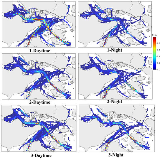 The distribution of ship conflicts during the day and at night is explored; that is, the ship conflicts in the time periods of 06:00–18:00 and 18:00–06:00 are counted, and two conflict distribution images are generated every 10 days, as shown in Figure 17, where “Daytime” in the sub-image represents the conflict distribution in the time period of 06:00–18:00, and “Night” represents the conflict distribution image in the time period of 18:00–06:00. As can be seen from the figure, the degree of conflict is more severe during the day than at night, the number of conflicts is larger, and the high-risk areas are concentrated in the waters of the intersection of the Luotou Waterway and Zhitouyang, Fodu Waterway, Xiazhimen Channel, and the southern part of Damao Island. Among them, the waters south of Damao Island are the main roads connecting the port hub with offshore ship traffic. It is the area with the highest ship traffic density and the highest frequency of ship encounters in the port; the intersection of the Luotou Waterway and Zhitouyang waters, and the intersection of the Xiazhimen Channel and Zhitouyang waters are both navigation warning areas officially established by the maritime department, which verifies the accuracy and effectiveness of this article’s conflict research at the micro-time and space scale.
