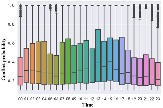 Figure 18 shows the characteristics of the distribution of the hourly conflict probability values in the study waters. It can be observed that the median conflict probability fluctuates slightly over time. In the 11:00–15:00 time period, the median of conflicts between ships is larger than that in the other time periods. The possible reason is that the ship traffic volume in this time period is large and the possibility of dangerous encounters between ships is high. The maximum conflict probability is basically maintained at 1, which means that ship encounters with high conflict severity will occur at every time period. VTS centers can use indicators such as the median and maximum values to more comprehensively understand the real-time collision risks and traffic complexity in the region, thereby improving their ability to deal with dangerous encounters caused by high traffic intensity.