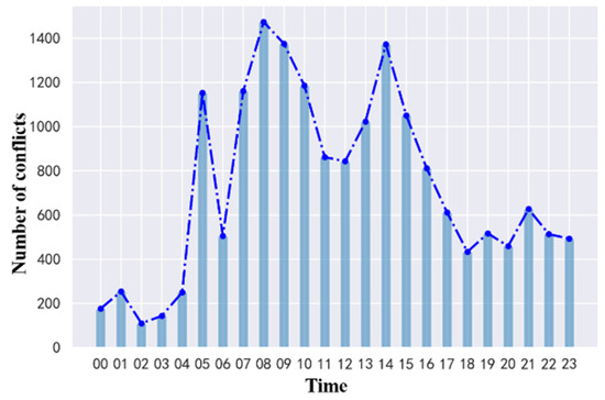 Figure 19 shows the number of conflicts per hour in the study waters. It can be seen that ship conflicts occur more frequently in the time periods of 05:00, 07:00–11:00, and 13:00–17:00, which is consistent with the actual traffic conditions in the study waters, because the ship traffic density is higher during the day. Based on the identification results of the conflict distribution in time and space, marine navigators and maritime departments can have a deeper understanding of when and where to enhance situational awareness during the navigation process of ships, providing a valuable reference for traffic regulatory departments to formulate and implement appropriate regulatory strategies.