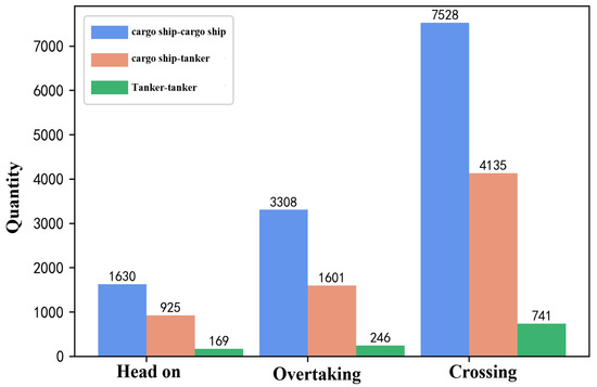 The distribution of conflict severity and the corresponding cumulative probability distribution are shown in Figure 20. It can be seen from the figure that the severity of most conflicts is below 0.2, which indicates that the probability of a ship being involved in a higher conflict is much lower than the probability of it being involved in a minor conflict. In order to further demonstrate the characteristics of the detected conflicts, Figure 21 shows the number of different conflict types among the different ship types. It can be seen that the number of crossing encounter conflict types is the largest, followed by overtaking, and then head-on. Compared with overtaking and head-on conflicts, the proportion of conflicts in crossing encounter scenarios is higher mainly because the relatively large angle range is classified as crossing encounters. In addition, the number of conflicts between cargo ships in the three encounter scenarios is much higher than that of the other ships, which may be due to the large number of cargo ships in the study waters and the frequent encounters.