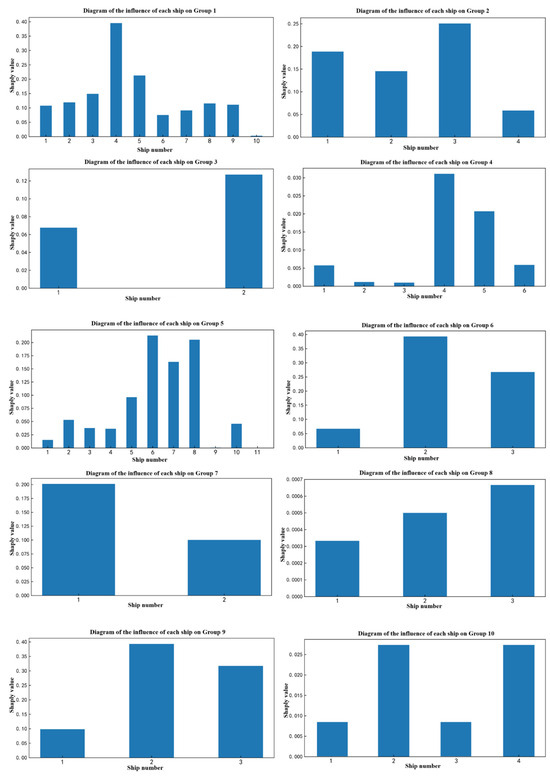 According to the ship group extraction algorithm proposed in this paper, the ships in the study waters at a certain time are divided into 10 ship groups, as shown in Figure 22. The contribution value of each ship in each ship group obtained by the Shapley value method in the cooperative game is shown in Figure 23. The collision risk and traffic complexity of each ship group are shown in Figure 24.