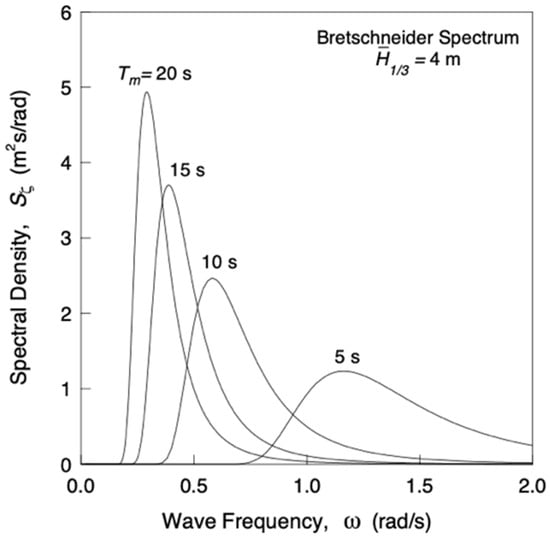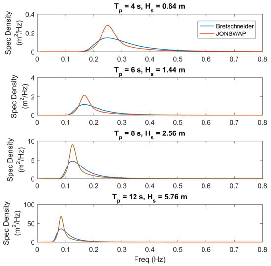 The JONSWAP spectrum can be also incorporated into the Bretschneider one. This spectrum is used to reproduce the highest peaks and frequency shifts that occur in a limited-fetch storm, which otherwise could not be represented by the Bretschneider and Pierson–Moskowitz spectra, for the same energy of the sea state (Figure 3). For this reason, the JONSWAP spectrum is able to describe a developing storm situation much more accurately than the Bretschneider spectrum [13,14]. Its mathematical definition follows the expression (3):