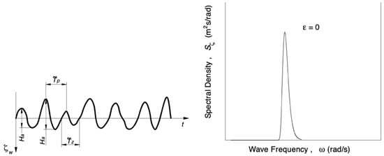 A wide-band process, instead, contains energy on a wider range of frequencies [19]. In this case, the average time interval among peaks is far less than the average zero-crossing period (Tp << TZ) (Figure 6). It is observed that, although spectral and temporal descriptions of the sea are interchangeable, the reconstruction of a time series might not exactly match the characteristic quantities of the reference spectrum (e.g., HS, TZ). In this context, ad hoc techniques have been developed to improve matching accuracy, as discussed in [20].