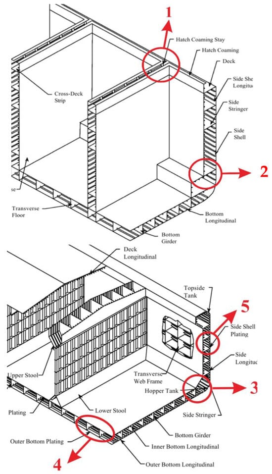 Although simplified fatigue assessment methods vary among classification societies, they generally follow four key steps: determining fatigue loads, calculating the long-term distribution of stress ranges, evaluating the structure’s fatigue capacity, and assessing fatigue damage. These methods are typically applied to local details and are suitable for urgent cases. Branko Blagojević [30] conducted a comparison of various simplified procedures used by classification societies for assessing ship structural details, including connections in the hopper tank, topside tank, and double bottom of a bulk carrier. The study highlights that minor changes in the shape parameter of the Weibull stress probability distribution can significantly impact the fatigue life of structural components.