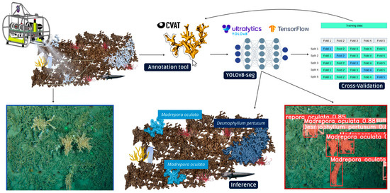 Workflow for cold-water coral analysis: Underwater imagery from a ROTV was annotated in CVAT to train the YOLOv8l-seg model. Five-fold cross-validation ensured model robustness before inferring new imagery, accurately detecting and segmenting coral species.