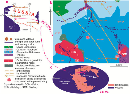The geology of the study area is heterogeneous (Figure 1b). It is dominated by Lower–Middle Jurassic siliciclastic rocks and Upper Jurassic carbonate and siliciclastic rocks [35]. The former are folded and faulted in a complex manner; principally, there is a northwest–southeast-trending syncline with an axis located between the Dakh and Sakhray massifs [35]. The Upper Jurassic sedimentary complex forms a kind of north-dipping monocline, and this complex covers older rocks transgressively from the north and the west.