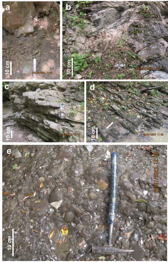 Conglomerate–breccias from Locality 5 pose a true challenge for the stratigraphical interpretation due to unclear contacts with the other sedimentary packages (Figure 4e). Ruban [23] attributed it to the Bambak Formation, but new observations [24] imply that these deposits are no older than the Khodz Group of a Late Triassic age (Figure 3), because clasts of its characteristic limestones are found in the conglomerate–breccias (this observation was also proven in the course of new field investigations in the summer of 2024). However, these conglomerate–breccias cannot represent basal horizons of the Psebay Formation (the Bugunzha Formation is locally absent) of a Jurassic age (Figure 3) because of the presence of an angular unconformity between the package of conglomerate–breccias and the Psebay Formation. The dip direction and angle of conglomerate–breccias is similar to that of Triassic deposits [23] and differs strikingly from those of the younger Psebay Formation. If so, the only acceptable option is that this coarse siciliclastic bed is older than the Khodz Formation and younger than the Psebay Group. Apparently, its age ranges within the late Rhaetian–early Hettangian interval. A bit younger, late Hettangian–early Sinemurian age cannot be excluded, but it is rather improbable because deposits of this age (if present) should be related to the Psebay Formation and share its structural setting.