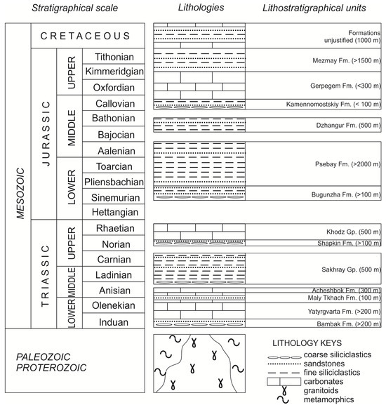 The Mesozoic stratigraphy of the study area is known rather well [24,25,38,39,40,41,42], although many details and even the nomenclature of lithostratigraphical units are yet to be fixed. The local sedimentary succession is dominated by siliciclastic and carbonate packages with a total thickness measuring several thousand meters and interrupted by a series of major hiatuses (Figure 3), often marked by coarse siliciclastic beds (Figure 2e). The most notable and widely distributed packages include dark and hard limestones of the Yatyrgvarta Formation, shales of the Sakhray Group, grey-to-black shales of the Psebay and Dzhangur formations, massive limestones and dolostones of the Gerpegem Formation, and siliciclastic red beds of the Mezmay Formation. These deposits accumulated in a tropical and subtropical sea on the margin of the Neo-Tethys Ocean (Figure 1c), which embraced back-arc basins [23,43], although temperate conditions could also exist in some time slices [44]. In the Norian–Rhaetian and the Oxfordian–Kimmeridgian intervals, reefal ecosystems flourished in the study area and marked a development of vast carbonate platforms.
