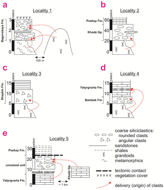 The presented characteristics of the considered localities of the coarse siliciclastic beds (Figure 4a–e) facilitates establishing their ages and correlation. Indeed, the regional stratigraphy (Figure 3) is taken into account for the purpose of the related interpretations.