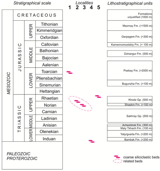 The situation with the younger rocky shores developed on the margins of the Dakh Crystalline Massif could differ. Localities 1 (early Toarcian) and 2 (Norian–Rhaetian) can represent the only short episodes when the preservation of coarse siliciclastics was possible. However, the massif remained a land mass since the beginning of the Triassic and until the mid-Toarcian (Figure 6), i.e., during >50 Ma (according to the numerical time scale [57]). During long time intervals, seas existed in the neighboring parts of the study area, and, thus, rocky shores could evolve for millions of years. If so, their deposits were eroded together with uplifts at the Anisian–Ladinian, Carnian–Norian, and Triassic–Jurassic transitions.